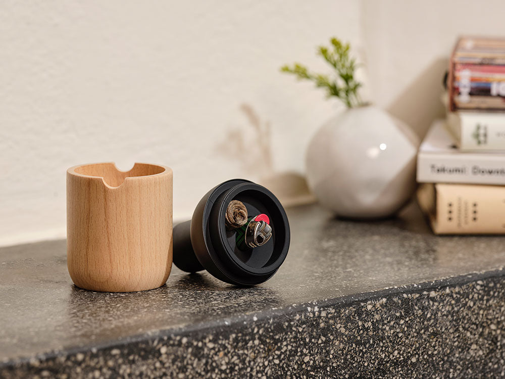 The Beacon is smell proof and designed to compliment the effortless beauty of indoor/outdoor living. The lightweight wooden base functions as a deep, portable ashtray while the durable powder-coated silicone top securely holds your go-to pocket size lighter and 10ft/3m hemp wick roll. With these two refined components, the Beacon assures a consistent spark to every at-home sesh.